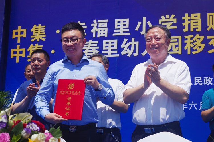 甘肅省慈善總會朱志良會長向甘肅中集實業(yè)集團有限公司董事長周啟濤頒發(fā)榮譽證書