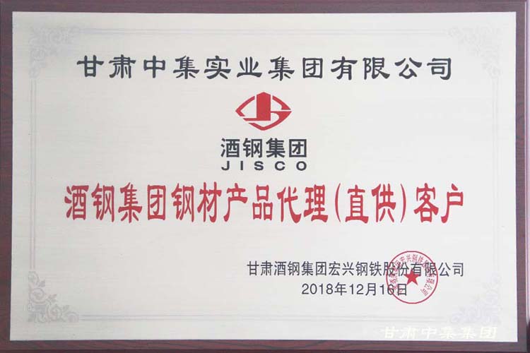 熱烈祝賀甘肅中集實業(yè)集團有限公司榮獲酒鋼集團“2018年度金牌代理商”殊榮
